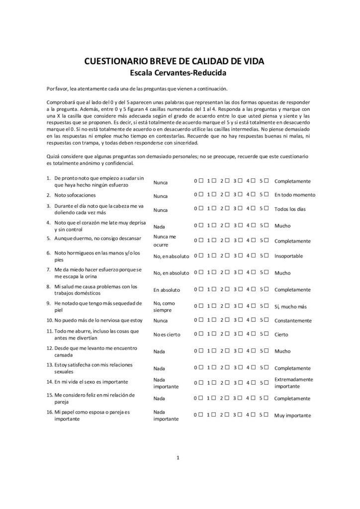 Por favor, lea atentamente cada una de las preguntas que vienen a continuación.Comprobará que al lado del 0 y del 5 aparecen unas palabras que representan las dos formas opuestas de responder a la pregunta. Además, entre 0 y 5 figuran 4 casillas numeradas del 1 al 4. Responda a las preguntas y marque con una X la casilla que considere más adecuada según el grado de acuerdo entre lo que usted piensa y siente y las respuestas que se proponen. Es decir, si está totalmente de acuerdo marque el 5 y si está totalmente en desacuerdo marque el 0. Si no está totalmente de acuerdo o en desacuerdo utilice las casillas intermedias. No piense demasiado en las respuestas ni emplee mucho tiempo en contestarlas. Recuerde que no hay respuestas buenas ni malas, ni respuestas con trampa, y todas deben responderse con sinceridad.